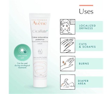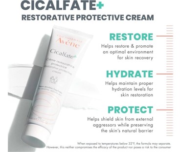 Umiruje, štiti i pomaže u popravljanju nadražene kože za cijelu obitelj. Tvori zaštitni sloj gdje se iritacija javlja u površnim slojevima epiderme i uz efekt “presvlačenja” koji štiti kožu. Njezina formula sadrži kombinaciju termalne izvorske vode Avène i [C-Restore]™ obnavljajućih i pročišćavajućih sastojaka: bakrovog sulfata i cinkovog sulfata. Cicalfate+ Repair zaštitna krema pogodna je i za vanjsku upotrebu na intimnim područjima.
